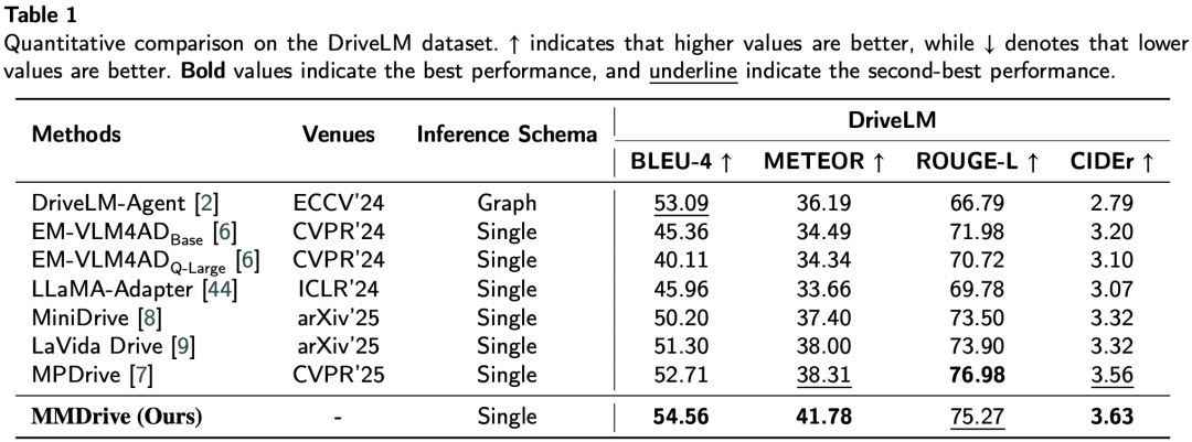 在 DriveLM 和 NuScenes-QA 两个权威基准测试中,MMDrive 均表现优异: