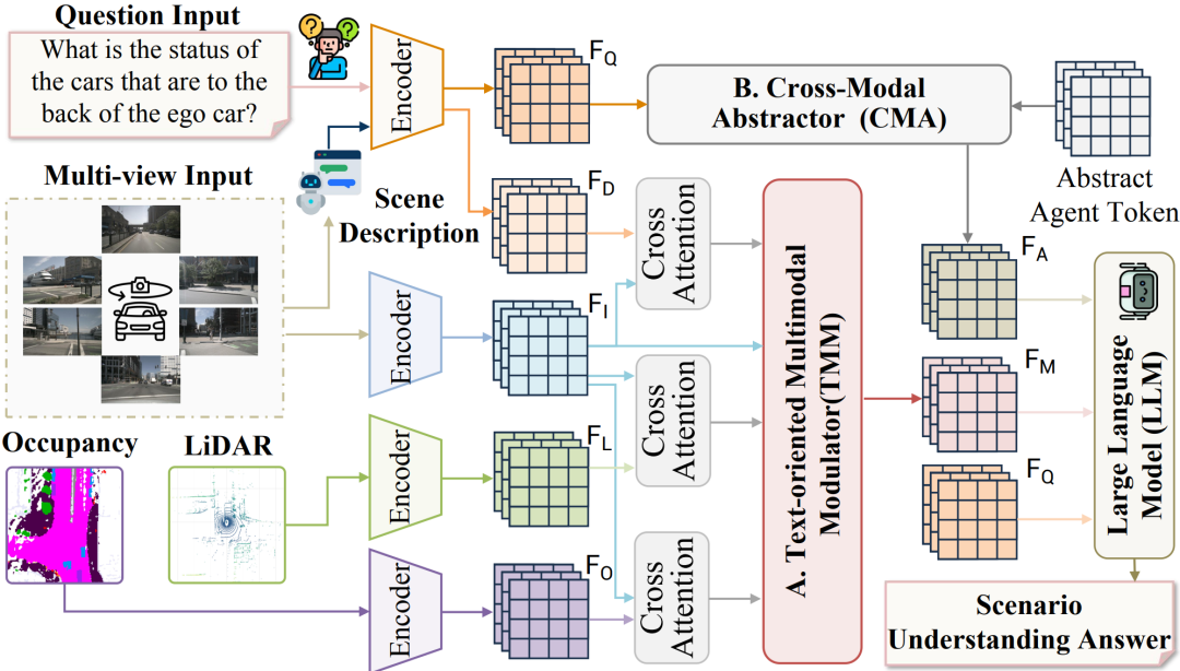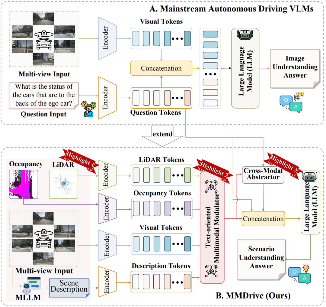 (B) MMDrive:该框架包含占用、激光雷达和场景描述模态,将传统的图像理解范式扩展到整体场景理解。它还融合了TMM和CMA,以实现多模态信息融合,从而增强在复杂驾驶场景中的表征能力和适应性。