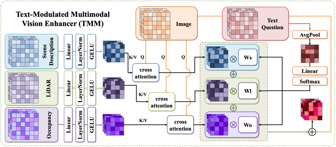 TMM通过将多模态特征投影到潜在空间,生成文本问题驱动的自适应融合权值,通过加权求和进行跨模态交叉注意,增强多模态场景表示能力,实现多模态融合。
