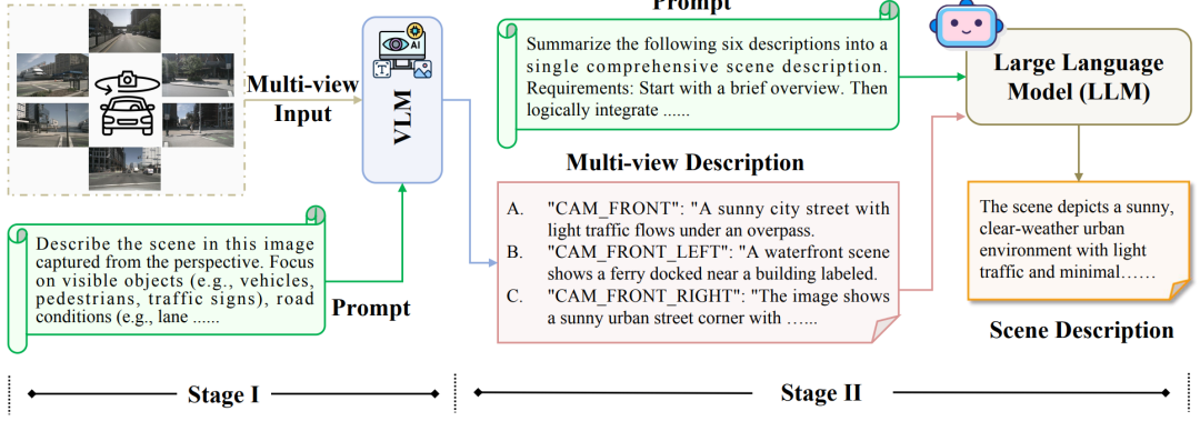 在第一阶段,将多视角图像和文本提示输入视觉-语言模型(Vision-Language Model, VLM)以生成相应的多视角描述;在第二阶段,将这些多视图描述与摘要提示一起输入到大型语言模型(LLM),以产生最终的场景描述。