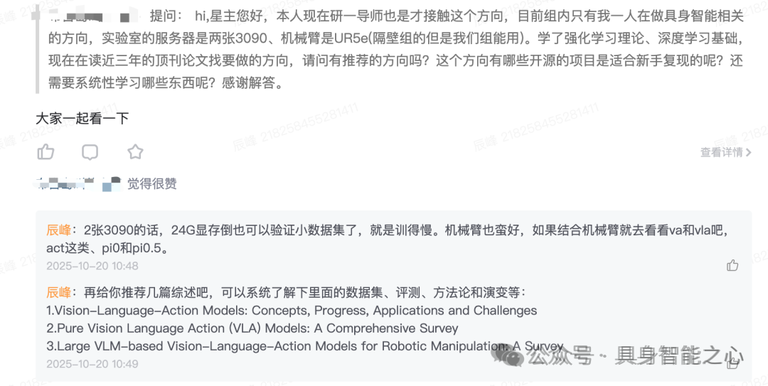 更有料的是:无论你是要找benchmark、还是要找综述和学习入门路线,都能极大缩短检索时间。星球还为大家邀请了数十个具身领域嘉宾,都是活跃在一线产业界和工业界的大佬(经常出现的顶会和各类访谈中哦)。欢迎随时提问,他们将会为大家答疑解惑。