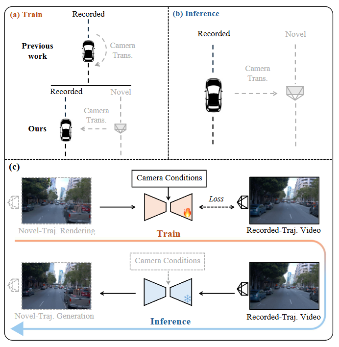 图3|训练与推理阶段相机轨迹变换方式的对比,以及本文采用的数据构造策略。(a–b) 展示了以往方法中训练阶段与推理阶段在相机轨迹变换模式上的不一致问题,这种不匹配会导致模型在生成新轨迹时表现不稳定。(c) 展示了 ReCamDriving 的训练与推理数据策略:通过 3DGS 渲染构造跨轨迹的数据对,使模型在训练阶段接触到与推理阶段一致的相机变换模式,从而提升对横向新轨迹生成的鲁棒性
