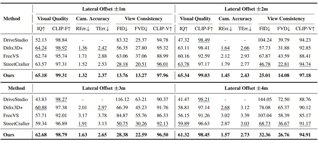 图5|在 Waymo Open Dataset(WOD)上的定量对比结果。该表从视觉质量、相机控制精度和视角一致性等多个指标,对比了不同方法在新轨迹生成任务中的表现。其中,加粗数值表示最优结果,下划线表示次优结果