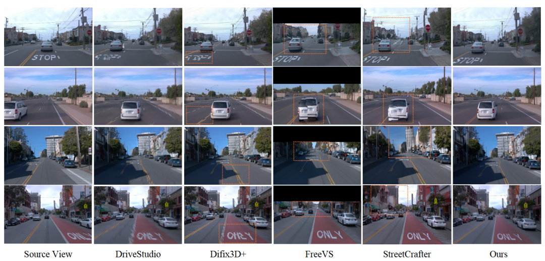 图7|在 Waymo Open Dataset(WOD)上的定性结果对比。该图对比了不同方法在新轨迹生成任务中的视觉效果。其中,ReCamDriving 和 Difix3D+ 都使用 DriveStudio 生成的新轨迹 3DGS 渲染结果作为输入,但前者将其用于相机控制,而后者主要用于画面修复。
