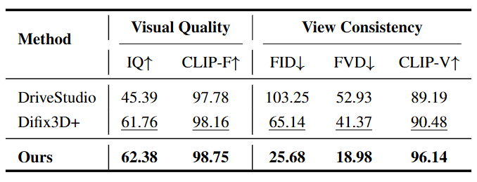 图6|在 nuScenes 数据集上的新轨迹视频生成平均性能对比。该表展示了不同方法在视觉质量和视角一致性相关指标上的整体表现,用于验证方法在不同自动驾驶数据集上的泛化能力