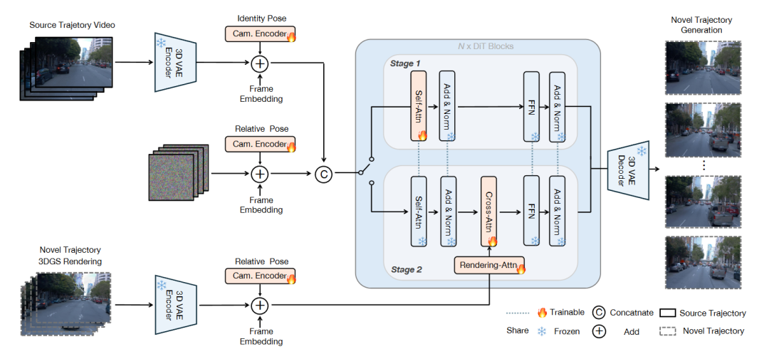 图2|ReCamDriving 的整体方法框架示意图。该方法采用两阶段训练策略,以实现精确且结构一致的新轨迹视频生成。在第一阶段,模型仅基于原始轨迹视频和相对相机位姿进行训练,重点学习基本的视角变换能力。在第二阶段,第一阶段的核心参数被冻结,并引入额外的注意力模块,将新轨迹的 3DGS 渲染结果作为结构引导信号,用于更精细的视角控制和几何约束。图中用蓝色虚线标出了在两个阶段之间共享的网络模块