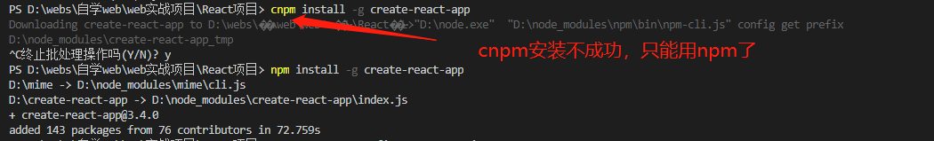 这是因为create-react-app指令默认调用npm,于是直接把npm的register给永久设置过来就好了,这样使用cnpm或者npm就没差别了。如下: