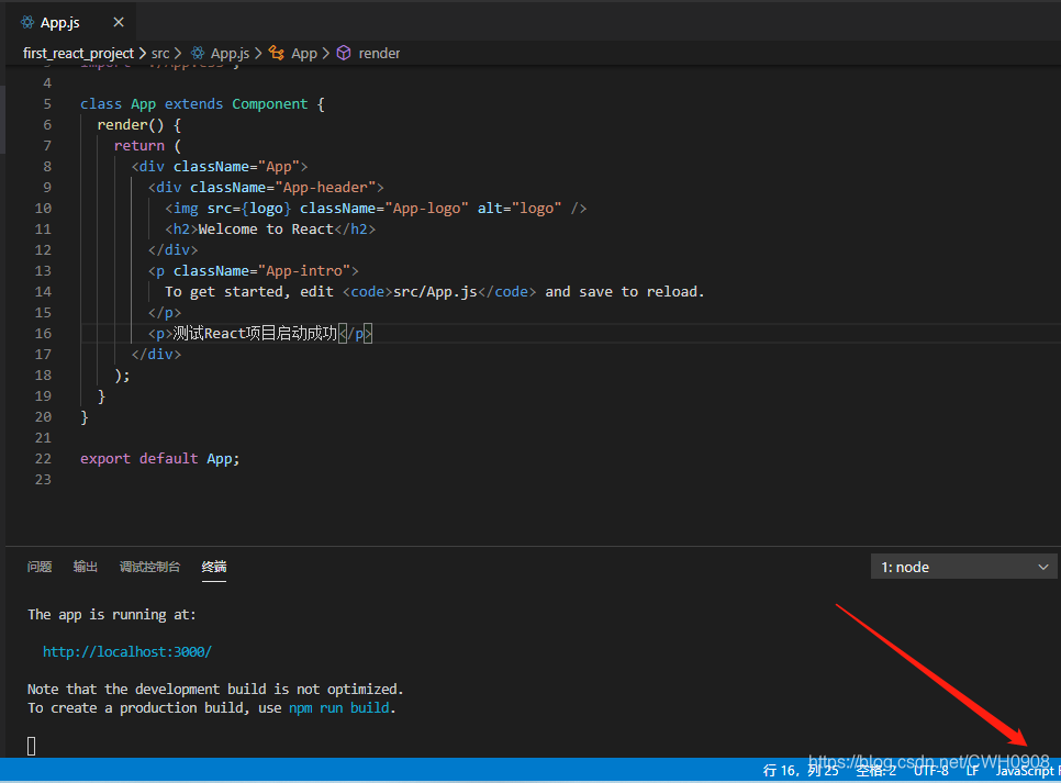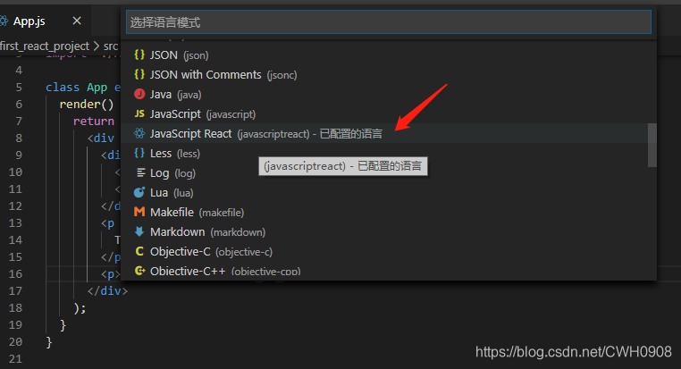 在有jsx代码的js文件里,选择VSCode的右下角JavaScript,弹出框选择JavaScriptReact