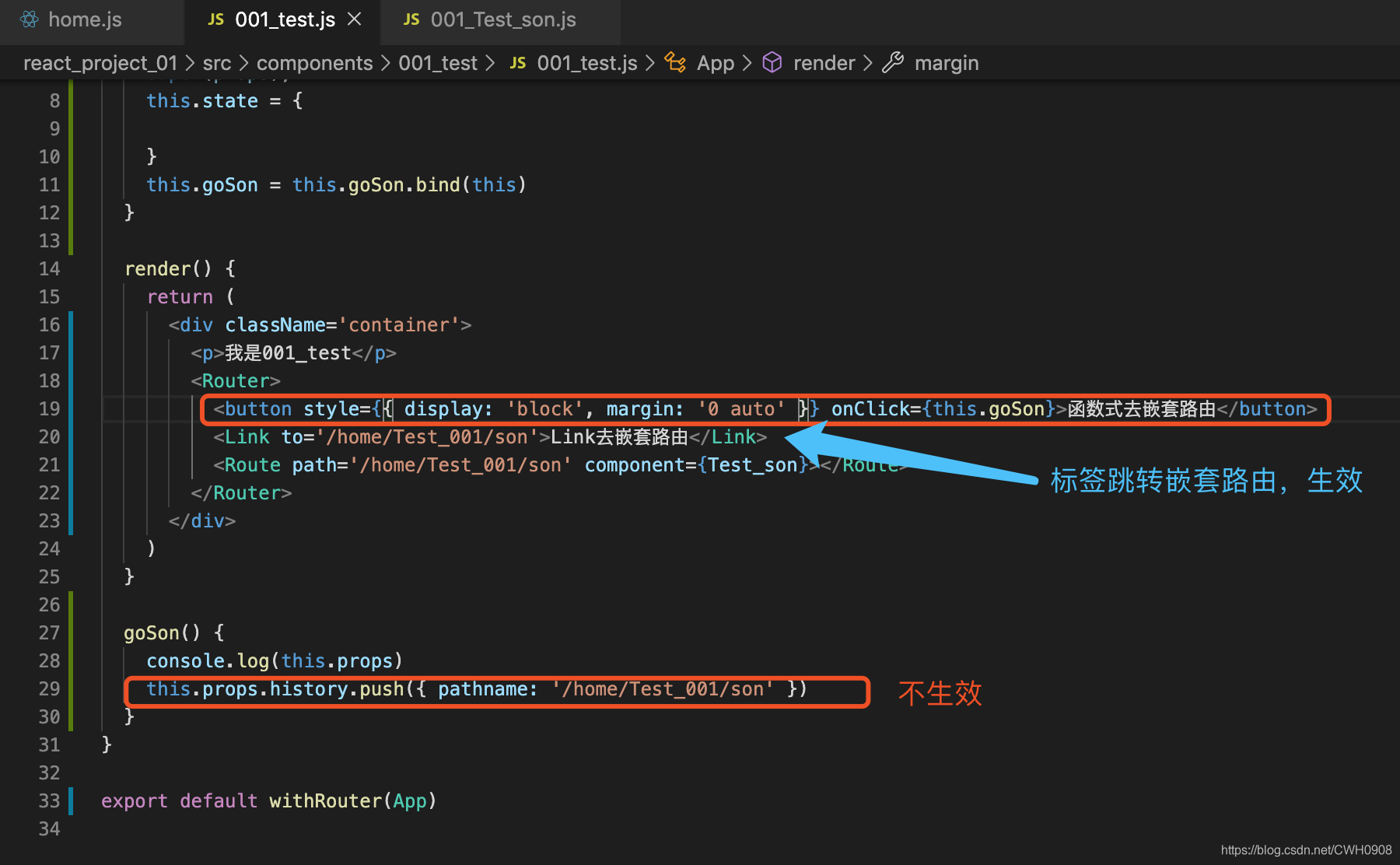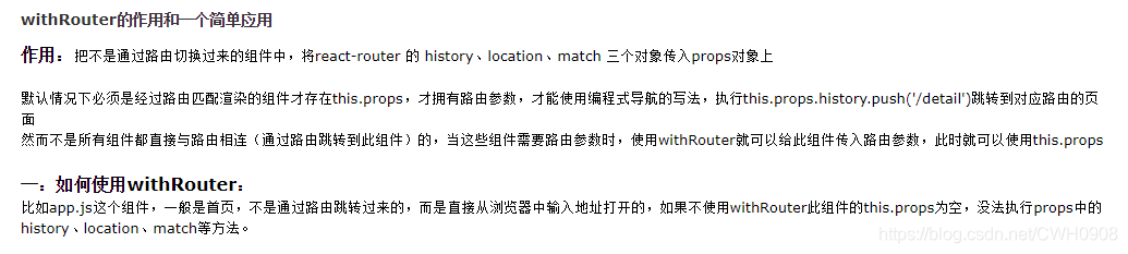 比如app.js这个组件,一般是首页,不是通过路由跳转过来的,而是直接从浏览器中输入地址打开的,如果不使用withRouter此组件的this.props为空,没法执行props中的history、location、match等方法。
