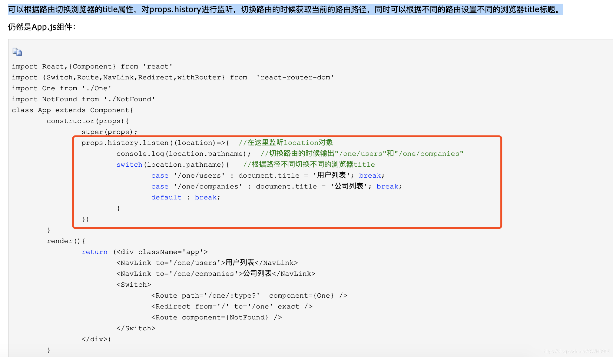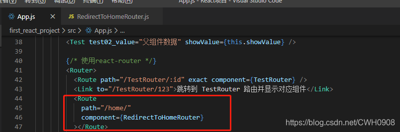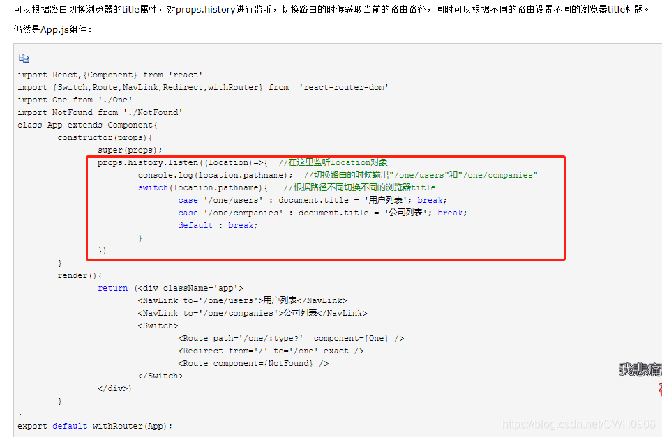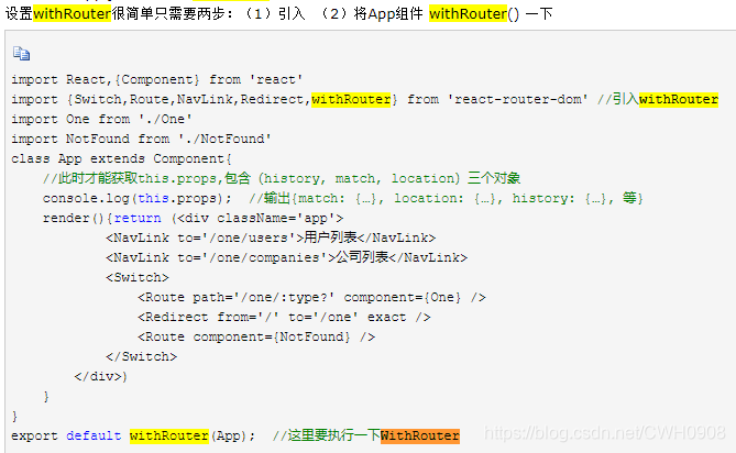 设置withRouter很简单只需要两步:(1)引入 (2)将App组件 withRouter() 一下
