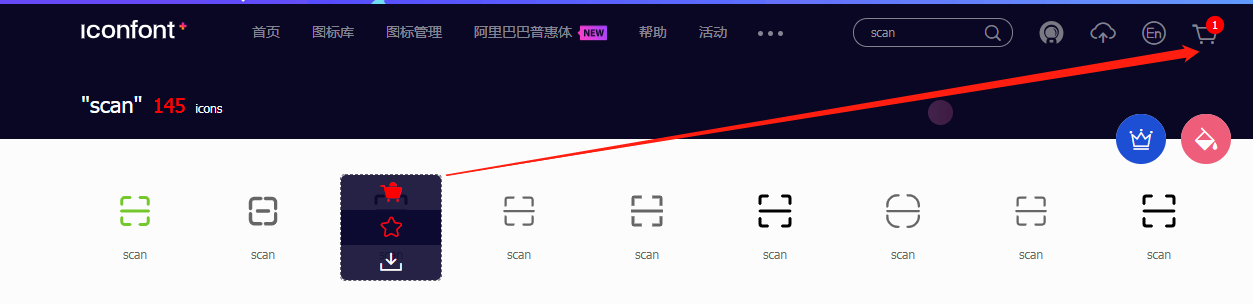 2、选择自己想要的图标,加入购物车;然后把购物车里面的图标添加至你的项目里面。