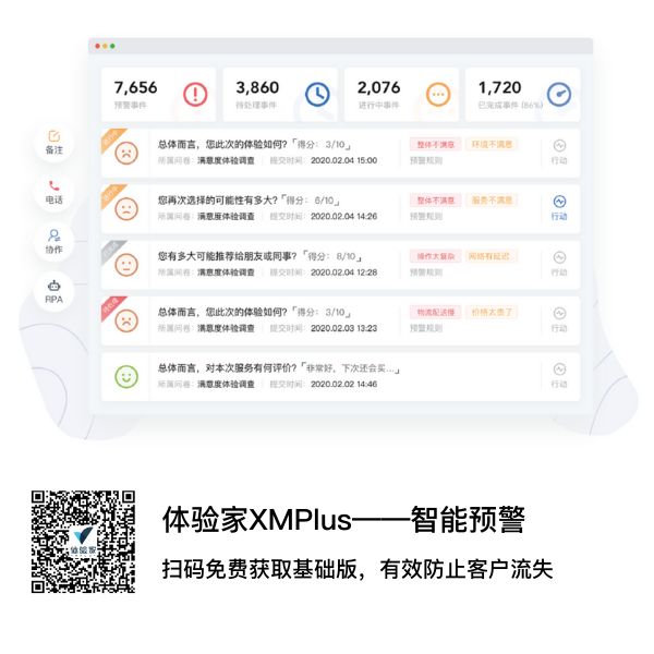 客户流失,是各行各业都会面临的问题。对于企业来说,客户流失并不可怕。可怕的是,企业无法了解到客户流失的原因,不能及时地采取措施,从而导致更多的客户流失。反之,如果企业能在第一时间察觉到客户的流失倾向,并及时地安抚客户,不但可以消除客户的不满,避免客户“离开”,还有利于提升客户的满意度,把他们转化为忠实客户。「体验家XMPlus」提供智能预警功能,可以帮助企业实时监测客户在售前、售中、售后各个环节的满意度情况,一旦收集到客户的负面反馈,会自动通知到相关的工作人员,提醒他们及时地安抚客户,帮助客户解决问题,从而有效防止客户流失,增强客户粘性和复购率,提升客户满意度和品牌口碑。