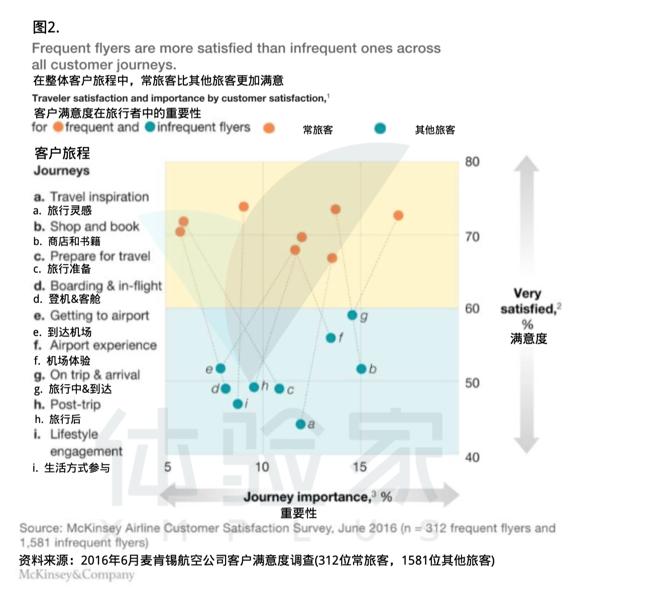 而且,对于不同的客户来说,不同的旅程阶段所意味的重要性也有所不同。以对某航空公司的调查为例(参见图2),与不经常坐飞机的旅客相比,经常坐飞机的旅客(以下简称为常旅客)更加重视“旅行中&到达”体验。而不经常坐飞机的旅客比较看重的“登机和客舱体验”却是一些航空公司的薄弱项。