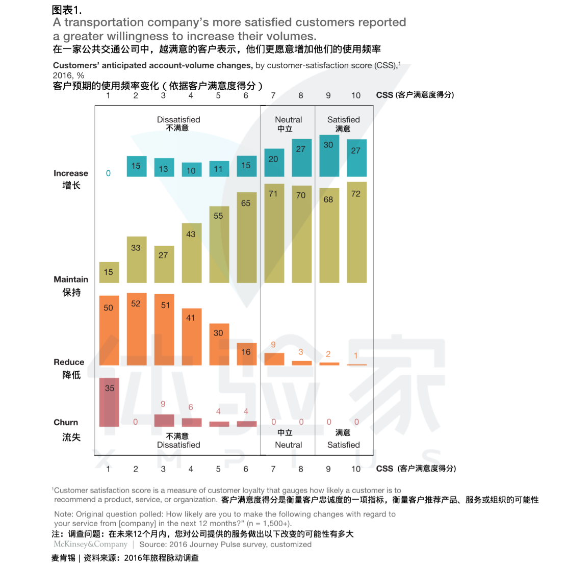 再举一个例子,一家公共交通公司在客户体验和收入增长之间建立了联系:它发现满意客户的使用频率是不满意客户的2倍之多(参见图1)。就连像政府一类的任务驱动型组织,也能够通过创造更好的客户体验而有所收获,比如提升任务完成情况,提高员工敬业度、财务收入,以及政府公信力等对社会有益的收获。