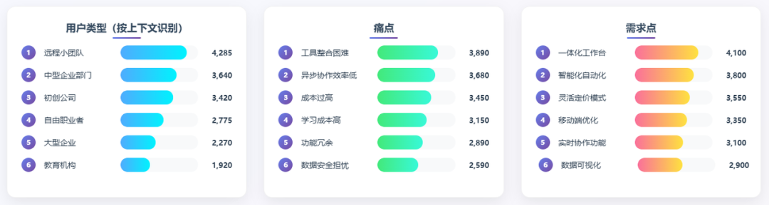 通过分析不同渠道、不同群体的VOC,细化目标用户的画像,包括他们的行为模式、偏好和期望,为后续的产品定位和营销策略提供基础。例如: 通过数据分析,识别出“远程小团队”对“轻量级、高集成度、支持异步协作”的工具需求强烈,而现有产品往往过于庞大或功能单一,这为新产品提供了明确的定位方向。