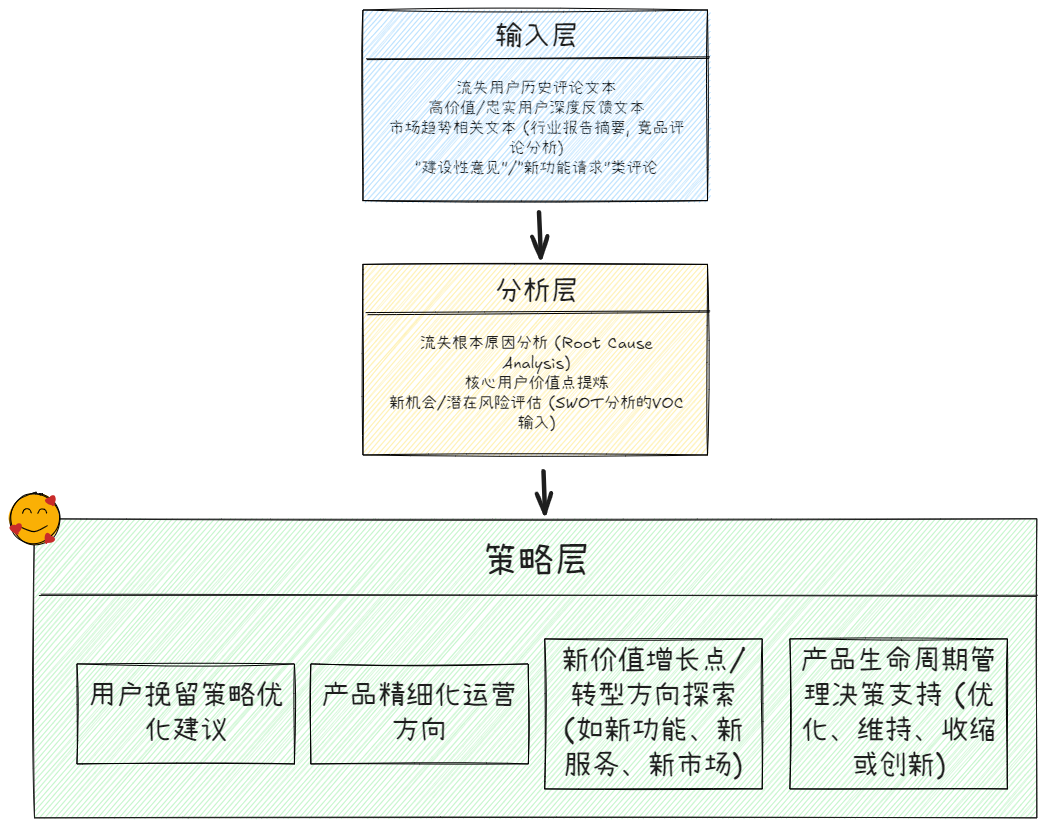 从流失用户反馈和市场趋势VOC中捕捉现有产品无法满足的新需求或市场空白,为产品的重大升级或战略转型提供数据支持。例如: 通过分析流失用户反馈,发现大量用户转向了提供“端到端解决方案”的竞品,提示现有产品可能需要从单一工具向平台或生态方向转型。