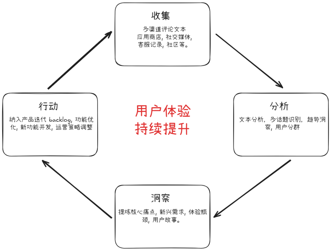 ● 用户行为路径结合VOC: 将用户在产品中的行为数据(如点击流、使用时长、转化率)与用户在特定环节留下的文本反馈(如错误页面的反馈按钮、退出时的问卷)结合分析,理解用户在何处遇到问题以及他们对此的感受。
