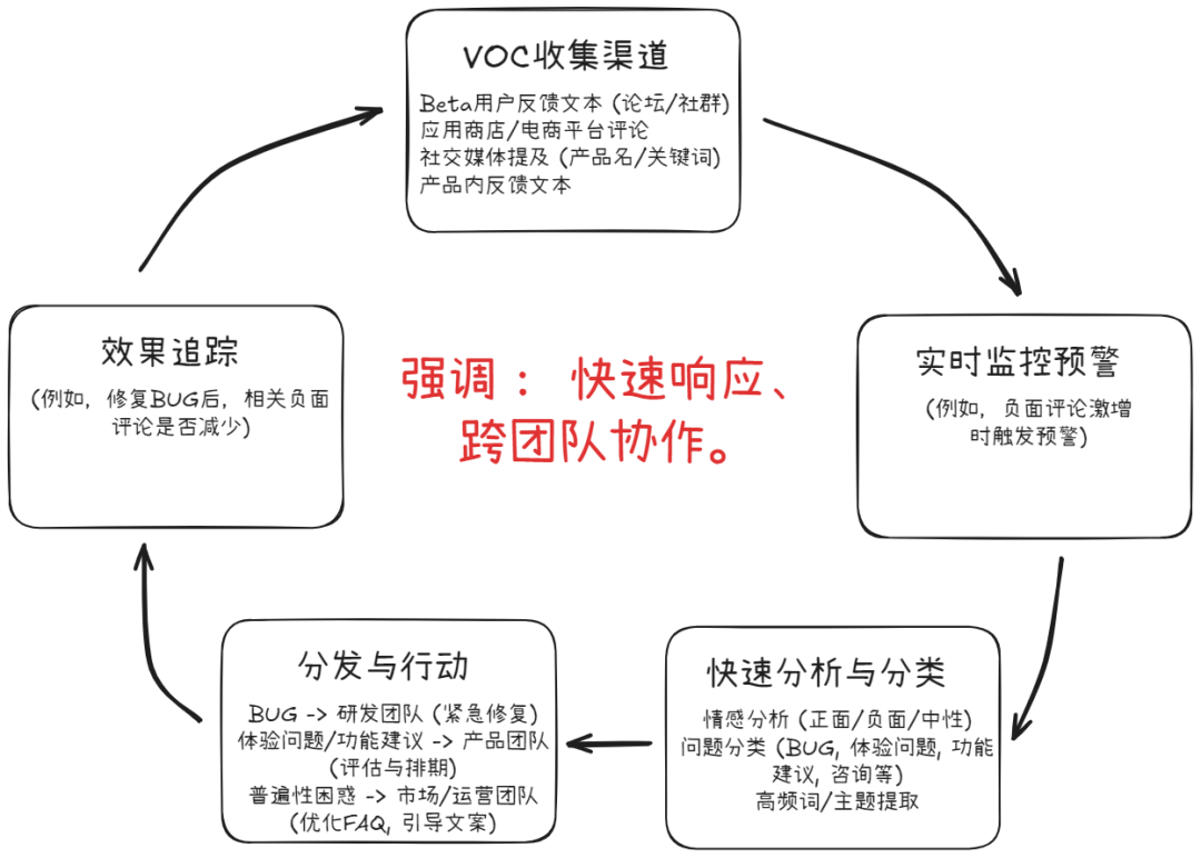 成长与迭代期的VOC来源广泛且持续产生,需要建立自动化的收集、分析和管理系统。