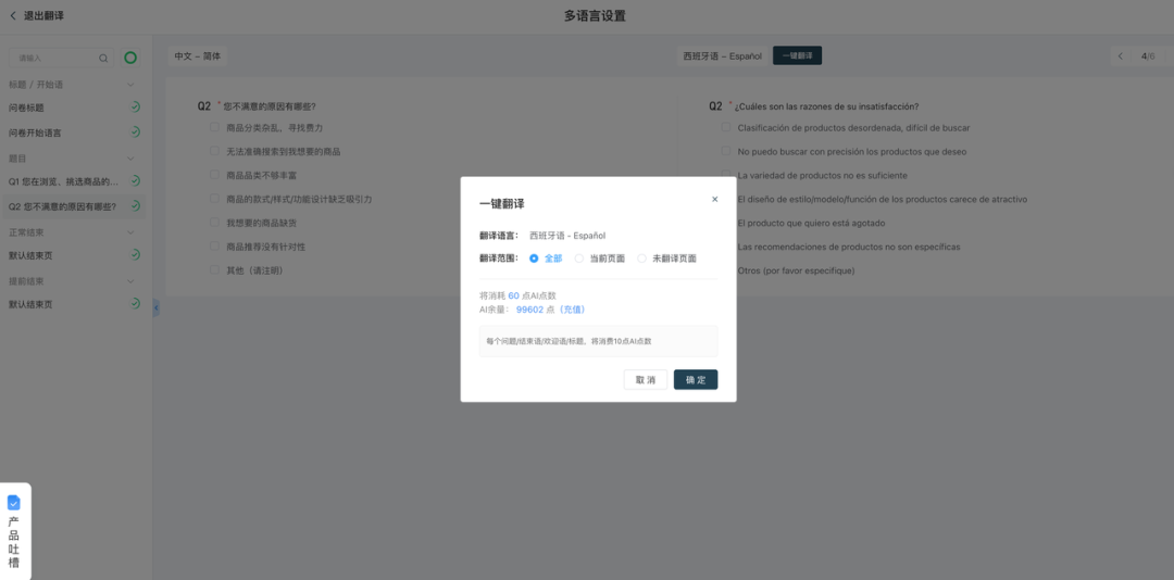 体验家内置AI一键翻译功能,并且通过提示词和翻译中可能存在误差的知识库进行调整,帮助AI将问卷快速翻译成多达12种语言。无论何种语言的问卷,只需点击“一键翻译”,稍等片刻即可完成整份问卷的内容翻译(包含标题/欢迎语/结束语等)。