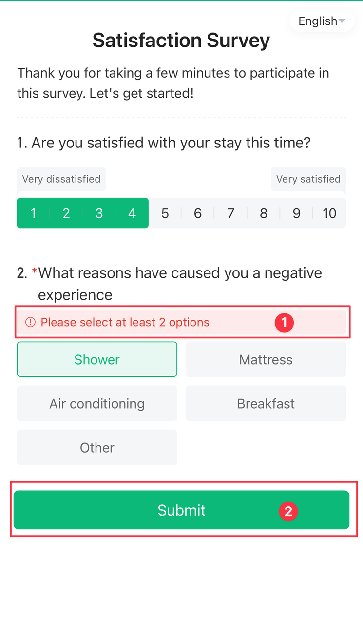 当客户回答时,体验家系统展示的问卷不仅题干和选项部分是外语,同时一些提示词也会转换为对应语言。例如下图标注1提醒被访者「本题要选择至少2个选项」,以及标注2的「提交」按钮也会自动翻译。(点击文章底部“阅读原文”即可免费注册使用)