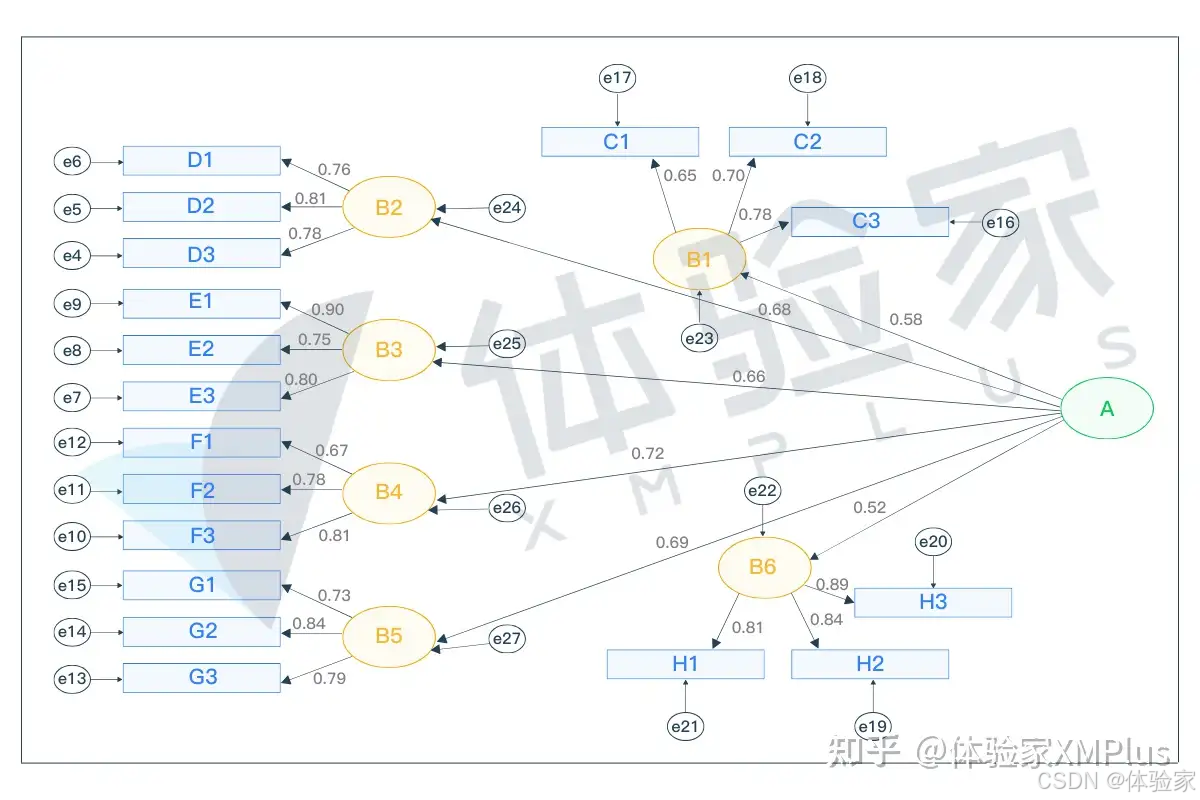 结构方程模型(Structural Equation Modeling,简称SEM)是瑞典统计学家、心理测量学家Karl·G·Joreskog于20世纪70年代中期提出⼀种统计分析方法,主要用于探索变量之间的关系。那么,如何用它来计算指标权重呢?让我们用下图来举例说明: