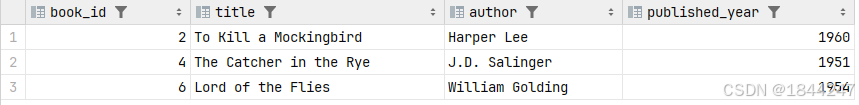 +---------+------------------------+------------------+----------------+ | book_id | title | author | published_year | +---------+------------------------+------------------+----------------+ | 2 | To Kill a Mockingbird | Harper Lee | 1960 | | 4 | The Catcher in the Rye | J.D. Salinger | 1951 | | 6 | Lord of the Flies | William Golding | 1954 | +---------+------------------------+------------------+----------------+解释:
