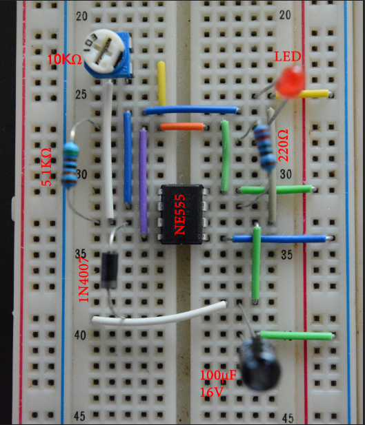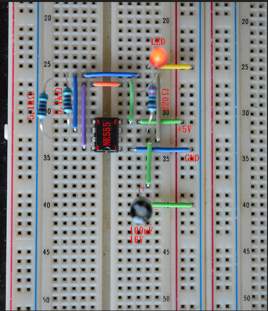 Uc 按指数规律上升,Uo输出高电平, LED灯点亮。当电容两端电压上升到 2/3 Vcc 后,输出Uo 变为低电平,LED灯熄灭。上升周期为 T1 = 0.693T,即 0.71 秒,此时放电管导通,令NE555第7脚接地,电容C1 经R2 放电,当电容两端电压下降到 1/3 Vcc 后,输出 Uo 变回高电平,下降周期为 T0 = 0.693 x R2 x C1,即 0.35 秒,然后开始下一个循环。故此,振荡器电路的周期为上升周期0.71 秒 + 下降周期0.35秒= 1.06秒, 倒数得出频率为 0.94 Hz。