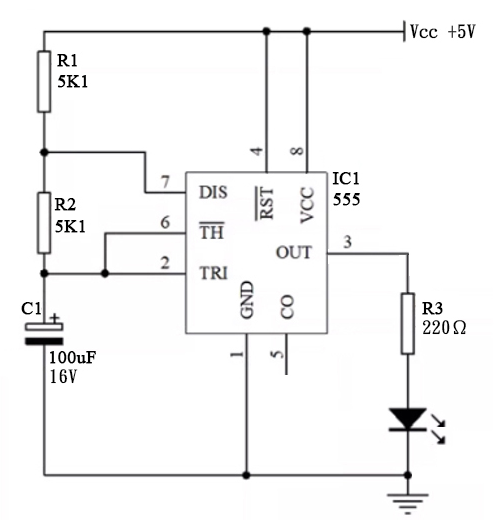当开启电源后,Vcc 经电阻R1、R2为电容C1 充电,充电时间常数 T = RC,