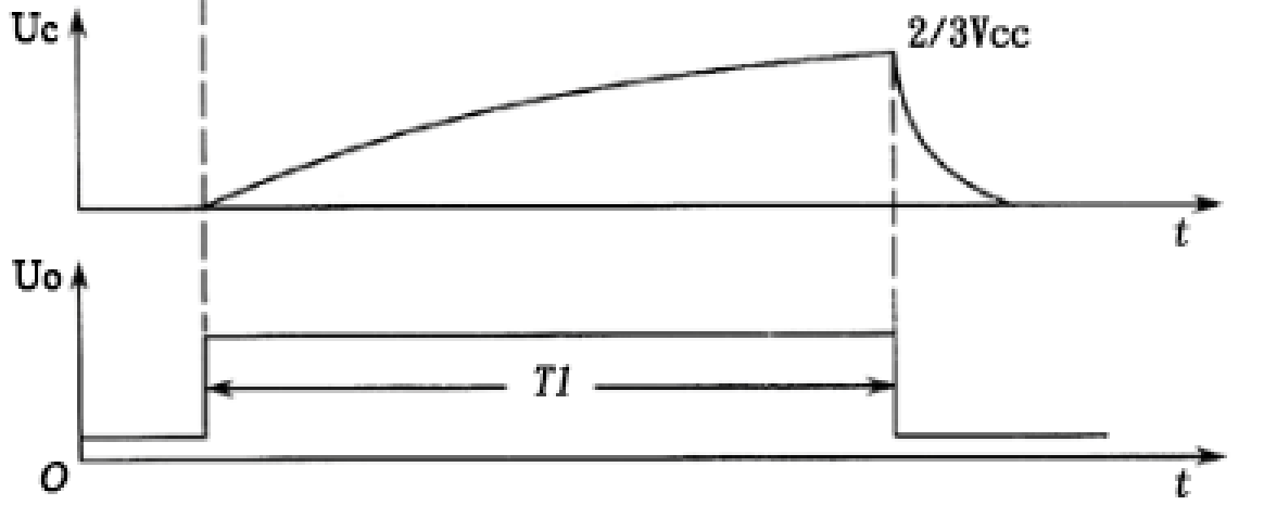 下图是电容C1两端电压Uc和 NE555 第3脚 OUT 输出电压 Uo 的波形: