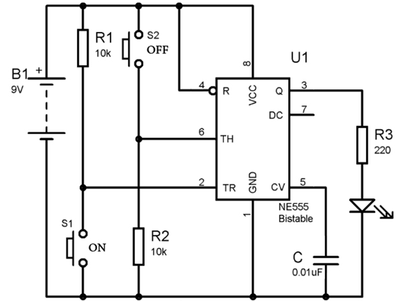 - 当按下按钮S2时,重置端(TH)接收到一个高电平信号,Q 引脚设置为低电平,并熄灭LED。
