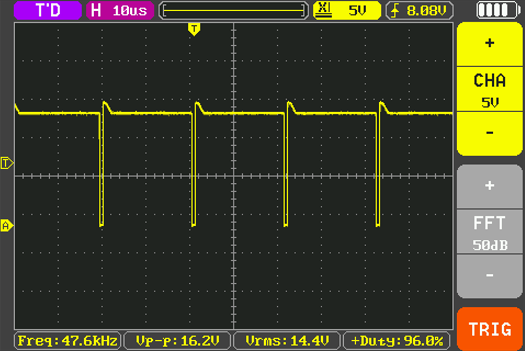 图5:第6脚输出 PWM 方波,2脚接地 (输出最大占空比),在没有电流保护、电压反馈之下,频率 47.6kHz,占空比高达96%。注意:第4脚产生锯齿波信号,上升沿 (表示充电开始) 此时第6脚输出PWM高电平;下降沿 (表示充电结束/放电开始) 第6脚输出PWM低电平。