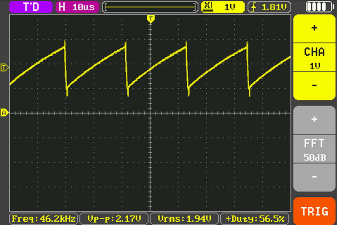 图4:UC3842第4脚产生锯齿波信号,频率为 46.2kHz,Vp-p 2.17V