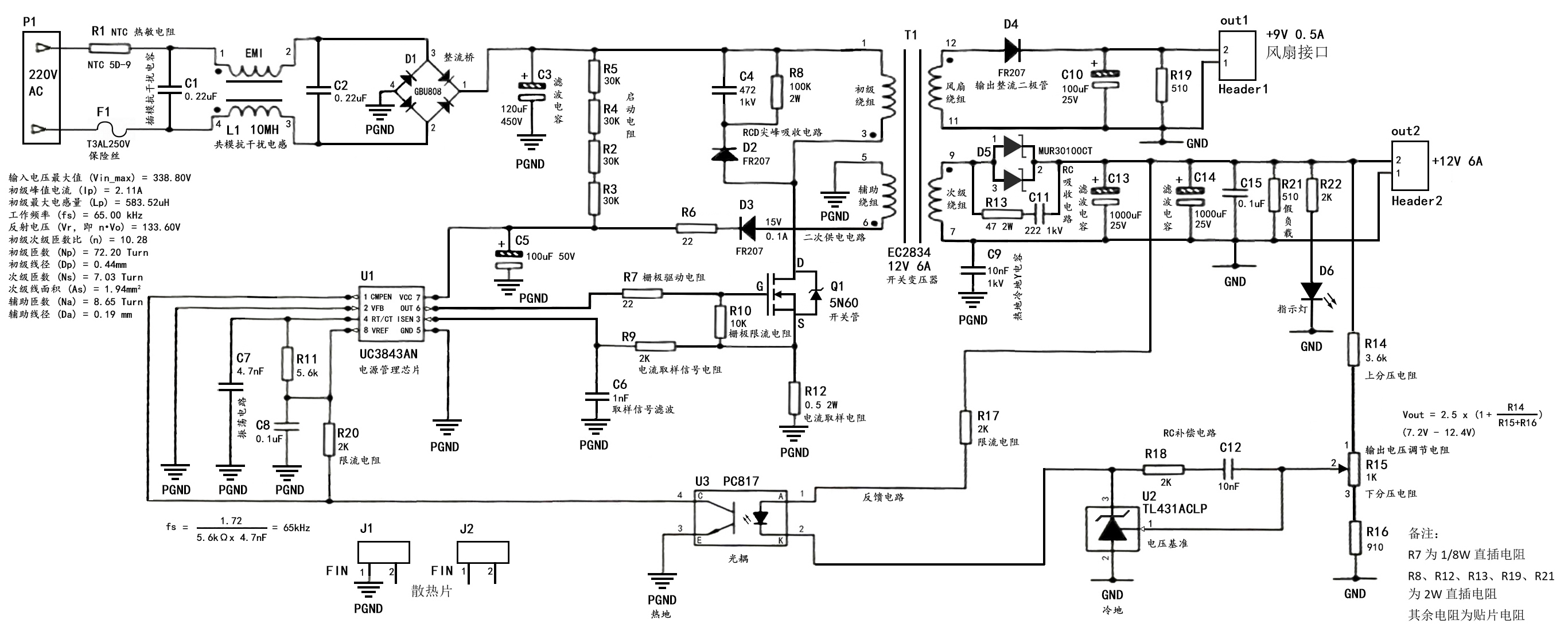 图10:3843 反激式开关电源 12V6A原理图 (注意:3843 VCCON为8.4V,VCCOFF 为7.6V)。