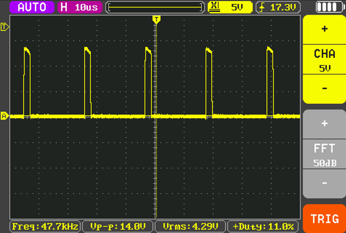 图6:第6脚输出 PWM 方波,2脚接地,固定负载,有电压反馈,频率47.7kHz, 占空比11%