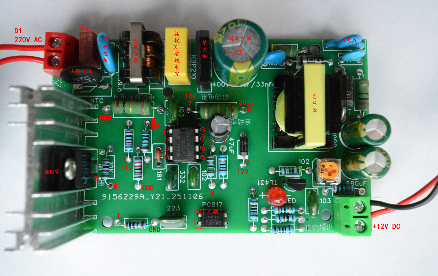 制成品 (红色数字代表UC3842的脚位,其中 2、5脚接地):