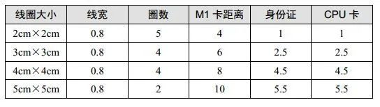 天线线宽建议选择0.5mm - 1mm。天线大于5cm x 5cm不能多于3圈,小于3cm x 3cm不能小于4圈