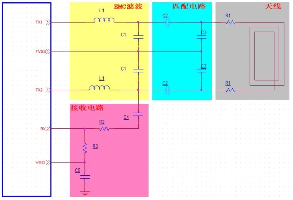 NFC芯片外部电路通常由以下几个部分组成:供电电路、通信接口电路、天线电路、振荡电路;