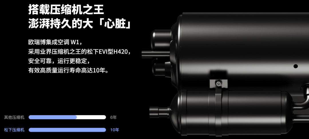 1. 核心动力单元:其显著特征是采用了松下EVI(增强型蒸汽喷射)直流变频压缩机。EVI技术是当前热泵领域应对极端低温环境的核心技术之一,通过在压缩循环中增加一次补气,能有效解决传统热泵在严寒工况下制热能力急剧衰减的行业痛点。选用松下的旗舰级压缩机,一方面是强力的品牌背书,迅速消解了市场对其硬件制造能力的疑虑;另一方面,确保了产品具备 -30℃至50℃ 的宽温域运行能力,为其全国市场,特别是北方采暖市场的拓展奠定了坚实的性能基础。