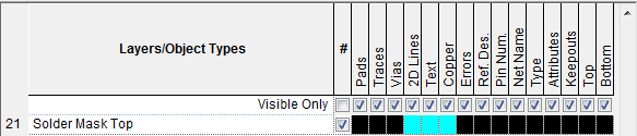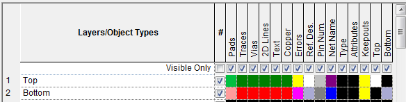 二、个人爱好,我一般把Top pads设置成为浅绿色,Top Trace/vias/2D Line/Text/Cooper设置成为深绿色,Error设置成为黄色,而Boottom pads 设置成为粉红色,Bootom Trace/Vias/2D Line/Text/Cooper设置成为红色,Error设置成为紫色。如下: