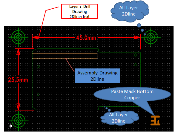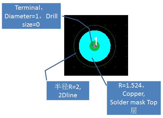 备注:该2Dline线径为0.0254,copper半径为1.524,在设置中心焊盘时,只需设置Mounted Side的Diameter。