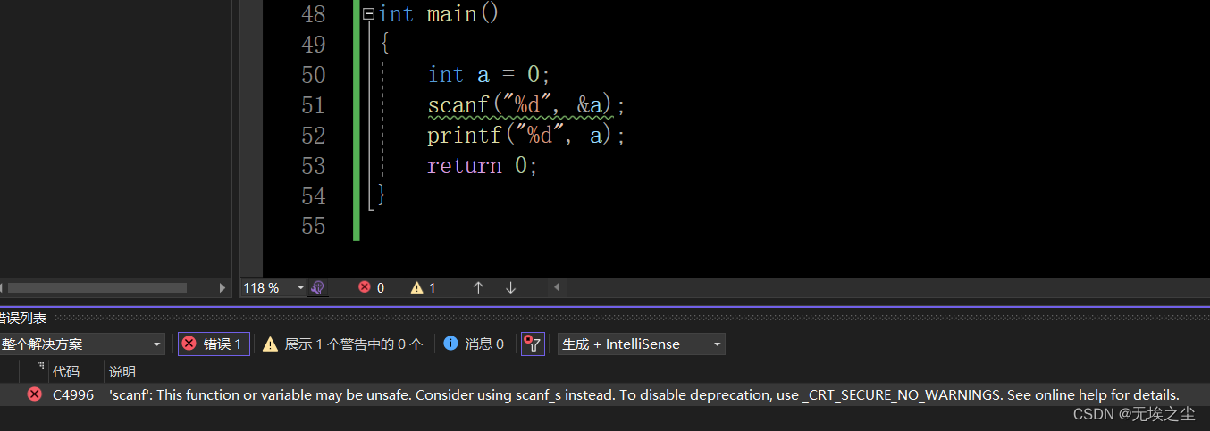 1.首先第一个方法是把scanf改为scnaf_s,因为vs2022认为scanf是危险的,vs2022只承认scanf_s。所以只要把scanf改为scanf_s就可以了。会英文的其实可以在vs显示的错误中找到这个方法。