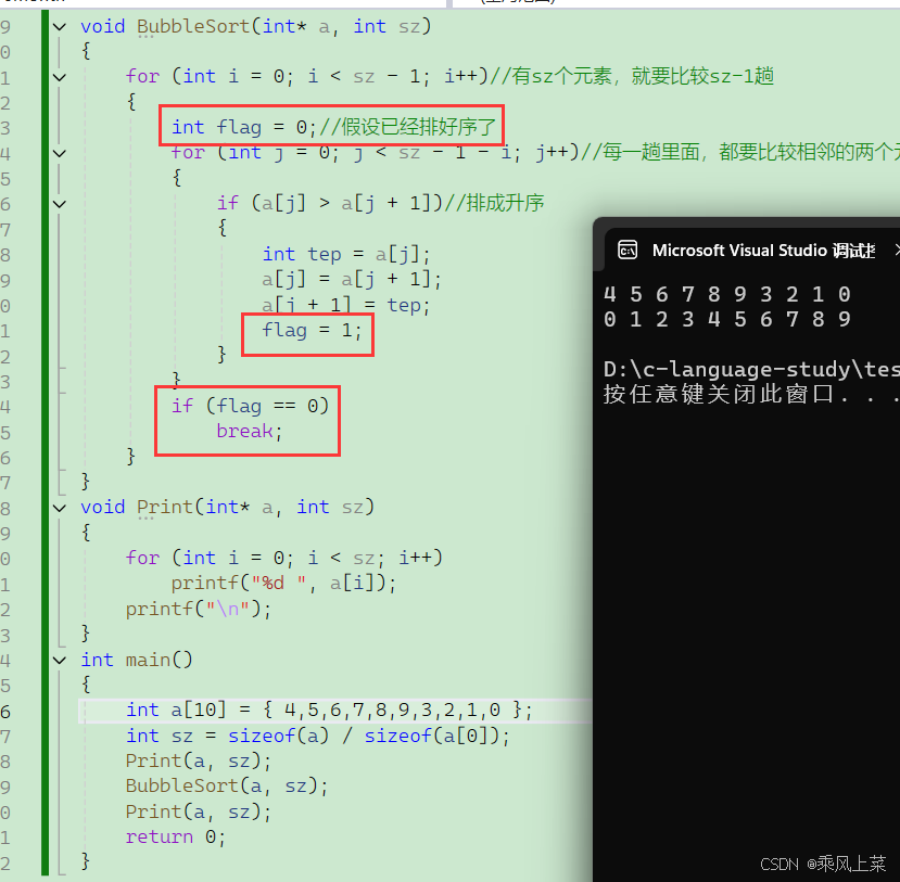 框出来的部分就是相对于初始的冒泡排序优化的地方,增加了flag来判断数组是否有序,当某一趟下来一次都没有交换时,那么就说明此时数组就已经有序了,不需要继续去排序了,就让它直接跳出循环。