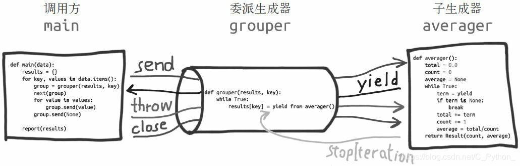 图 16-2:委派生成器在 yield from 表达式处暂停时,调用方可以直接把数据发给子生成器,子生成器再把产出的值发给调用方。子生成器返回之后,解释器会抛出StopIteration 异常,并把返回值附加到异常对象上,此时委派生成器会恢复