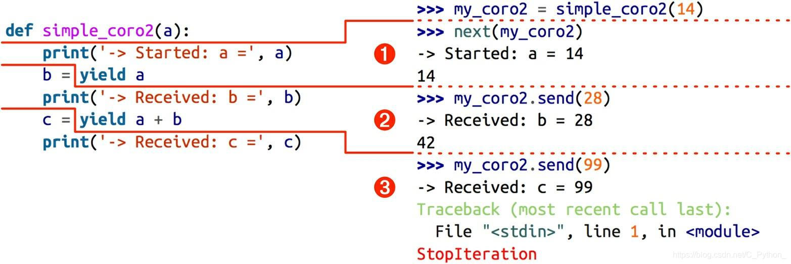 图 16-1:执行 simple_coro2 协程的 3 个阶段(注意,各个阶段都在 yield 表达式中结束,而且下一个阶段都从那一行代码开始,然后再把 yield 表达式的值赋给变量)
