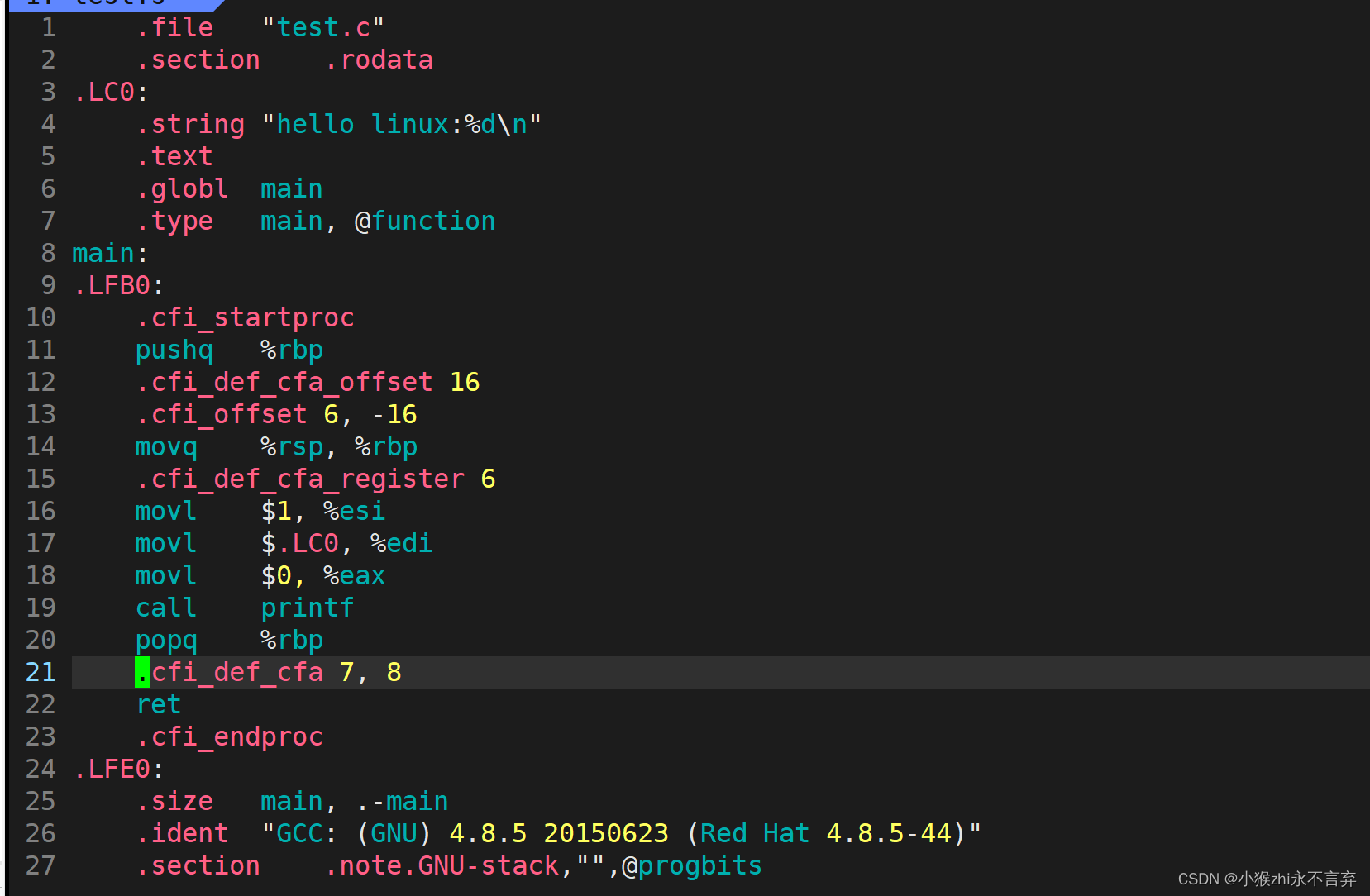 而这一过程的指令就是:gcc -S test.i -o test.s//这里其实-S后面跟test.c也行,只不过我们刚刚已经执行了预处理过程,紧接着就是编译,所以直接对test.i操作即可。