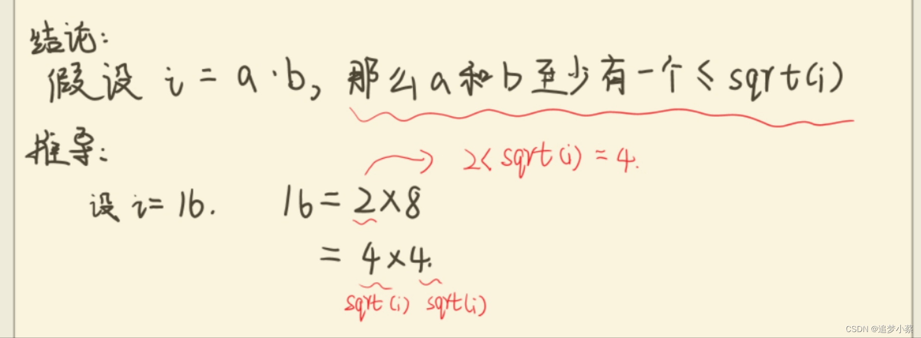 关于代码的,已经都在代码段中的注释有所解释。这里着重解释一下为什么在循环中 j 的取值为2~根号i,请C友看我下面的思路图