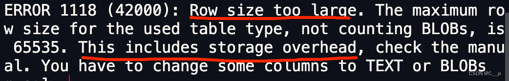从报错信息就可以知道一行数据的最大字节数是 65535(不包含 TEXT、BLOBs 这种大对象类型),其中包含了 storage overhead。
