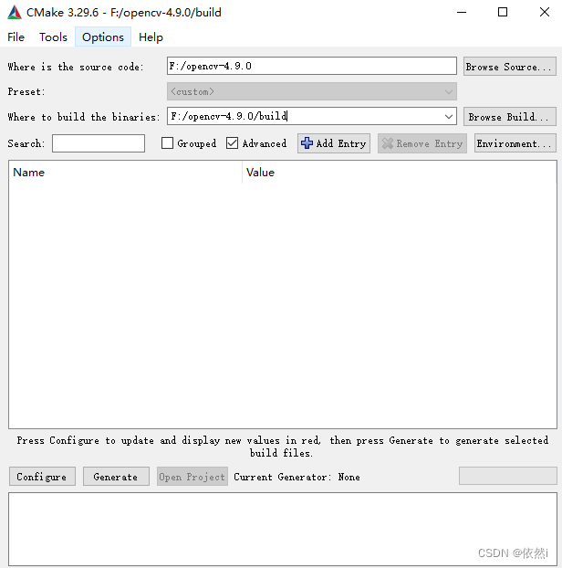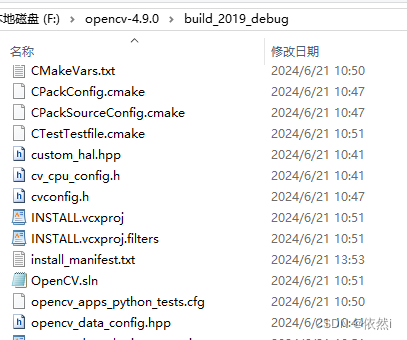 13.再次点击Configure,然后不报红就点击generate,报错就按照上面的解决报错,不然vs里大概率报一大堆错,费时费力。然后就会在build输出目录找到一个OpenCV.sln文件,在vs中打开这个解决方案,进行编译。