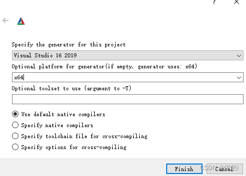 选vs2017 或 2019,平台一般就选x64,finish ,结束,显示这样