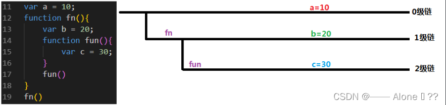 函数是写在全局中,也就是说,局部作用域是被嵌套全局作用域中的。函数中也是可以定义函数的,也就是局部作用域中可以再有局部作用域,这样就形成了作用域的嵌套,我们将这个链式结构叫做作用域链。